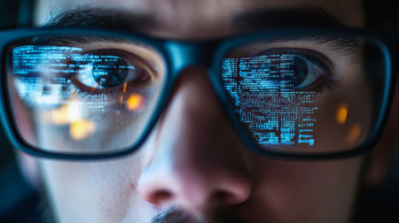 Close-up of a programmers eyes behind glasses, with digital code reflected on the lenses. Showcasing modern software development.