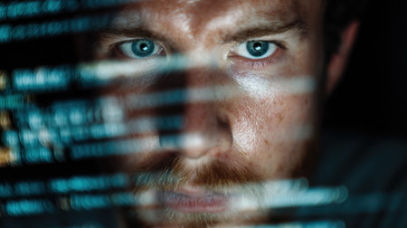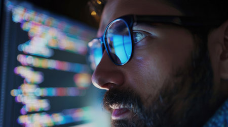 Intense focus of a male programmer analyzing data on a digital screen with a close-up view highlighting concentration and technology in a dark setting