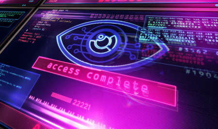 Cyber spying eye symbol on computer screen. Hacking, control, surveillance, supervise, digital invigilation and breach of privacy concept 3d illustration.