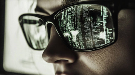 Reflection of a hacker in glasses, representing cyber security, digital technology, and safety.