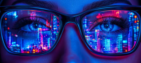 Hypnotic Gaze Womans Eyes Reflecting Cityscape Through Futuristic Glasses, Close-Up