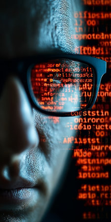 Reflections of Digital Code and Data Streams in Glasses Showcasing Cyber Security Vigilance