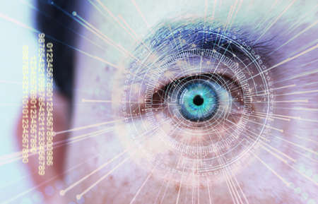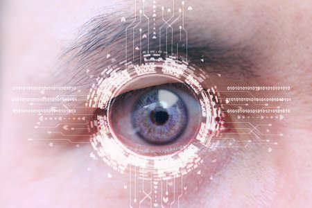 Human eye with futuristic digital interface reflecting augmented reality in a technological concept