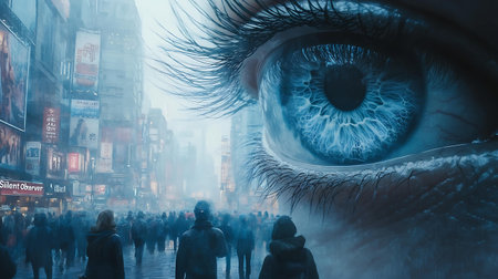 This close-up image features a vivid human eye with intricate details, showcasing a blend of natural beauty and digital technology elements for a futuristic feel.