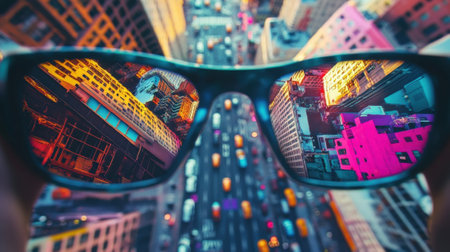 Vibrant cityscape through lens with bokeh effect, skyscrapers, traffic lights in high resolution
