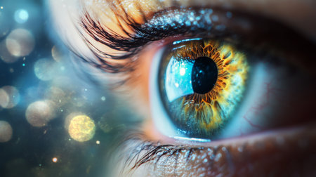 Macro shot of human eye with glowing golden and yellow particles in pupil. Close up of female eye with reflections in iris
