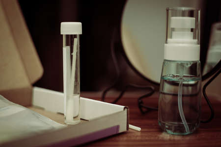 Covid-19 rapid antibodies test kit, home testing kit with nose swab and test tube for coronavirus, copy space