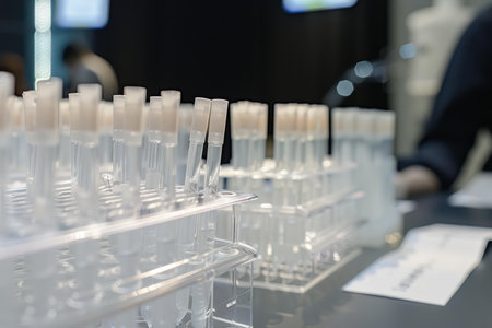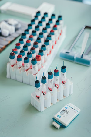 A vibrant assortment of test tubes arranged in a laboratory setting, showcasing essential tools for scientific analysis and highlighting the precision in research endeavors.