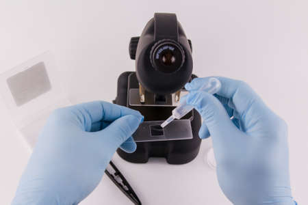 An optometrist wearing blue gloves measures visual acuity using special test glasses for lens selection. High quality photo