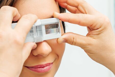 Ophthalmologist using special ruler tool to measure the distance between the eyes of patient