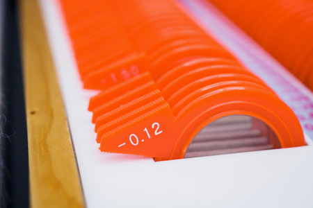 Set of lenses for trial frame glasses to examine eye visual system of patient with short or long power vision at ophthalmology clinic