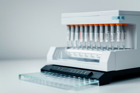 Closeup of a transparent PCR Polymerase Chain Reaction thermocycler with sample tubes visible within prepared for DNA amplification..