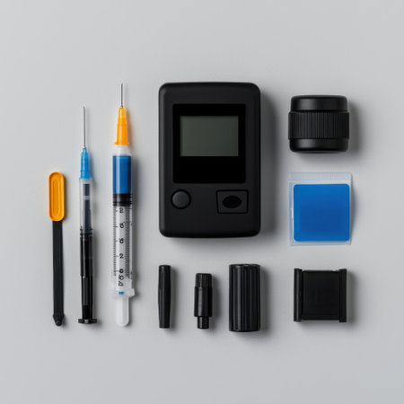 Medical equipment flat lay with syringes, insulin pen, vial, and accessories on gray background for healthcare and diabetes management projects