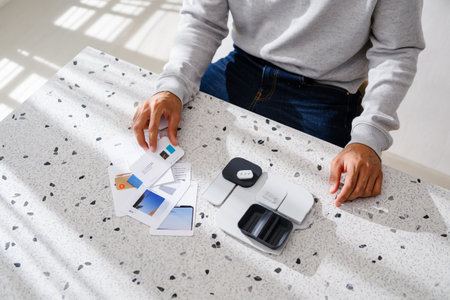 Person organizing cards. Terrazzo tabletop. Productivity arrangement.
