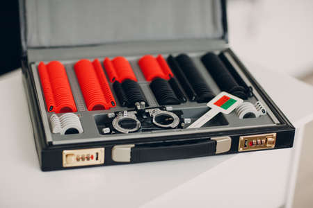 A set of lenses to check vision. A suitcase with magnite glasses. Equipment in the ophthalmologist's office. City Hospital. May, 2020, Brovary, Ukraine.