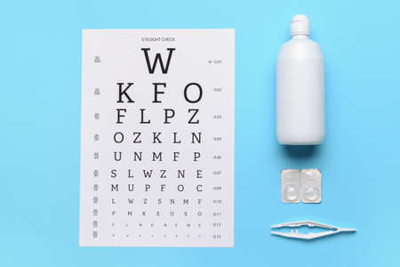 Eyeglasses with eye test chart and eye drops bottle on blue background. Vision examination, correction