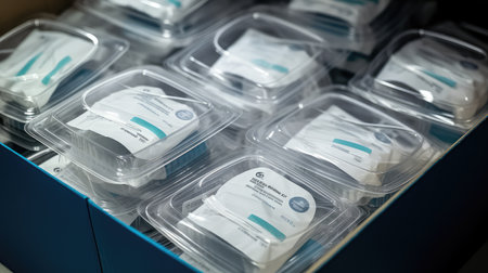 Nurse unpacking box with Covid-19 PCR kit in hospital warehouse, conceptual image