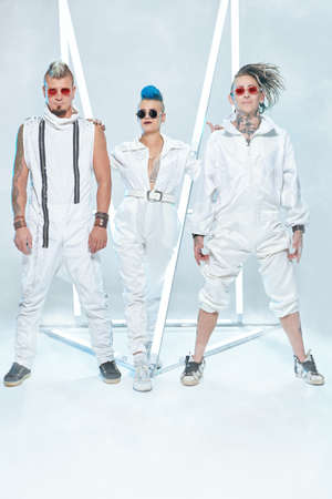 Three punk rock musicians in white overalls and cool sunglasses pose at the studio in neon light. Youth alternative culture. Full length shot.