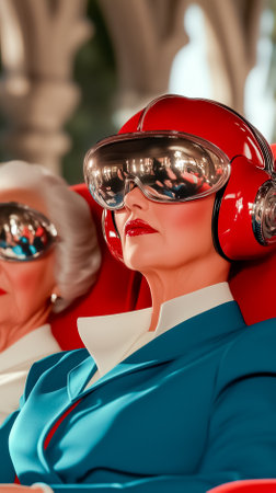 Seniors wearing virtual reality headsets engage in immersive experience while seated in futuristic chairs. Vibrant, colorful setting evokes innovation and technology concepts.
