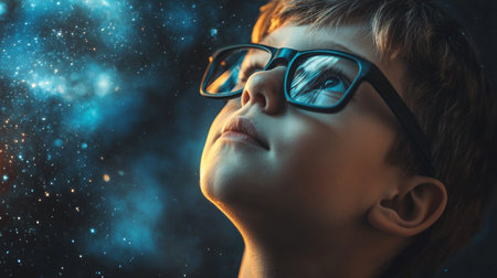 A curious child wearing glasses gazes at the starry night sky, symbolizing wonder, exploration, and imagination, with soft blue and golden lighting.