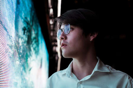 Horizontal shot of black hair guy in white shirt and eyeglasses standing at the LED billboard of shopping mall at night, he stop walking 'cause interested in the LED display.