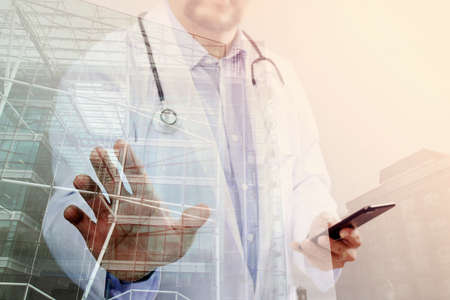 Double exposure of Medical technology concept. Doctor hand working with modern smart phone with medical chart interface,multi channel connection,London buildings