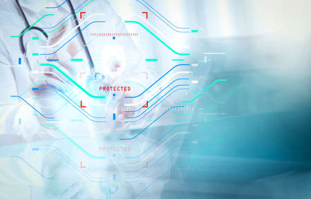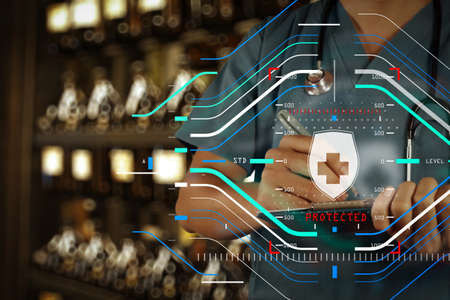 Data Security system Shield Protection Verification concept.Doctor hand working with stethoscope and laptop computer digital tablet with virtual dashboard interface