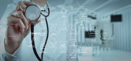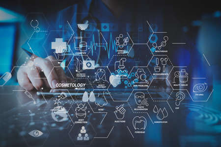 Cosmetology process with Beauty therapy,bodycare,healthcare,wellness treatment virtual diagram and Correction,rejuvenation,anti-aging procedure.success smart medical doctor with operating room background