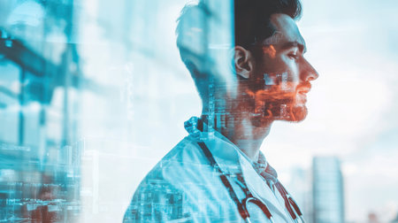 double exposure men doctor and hospital on white background