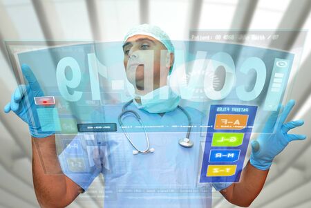 Doctor researching Corona virus cure, with digital screens