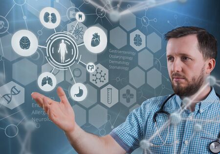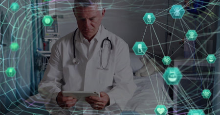 Image of network of connections with icons over caucasian male doctor. Global medicine, healthcare, connections and digital interface concept digitally generated image.