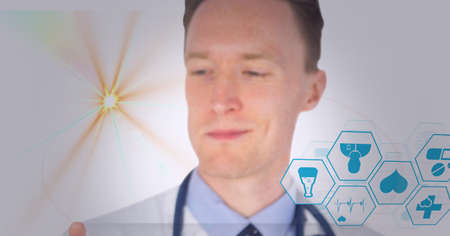 Spot of light and multiple medical icons over caucasian male doctor against white background. healthcare and medical professionalism concept