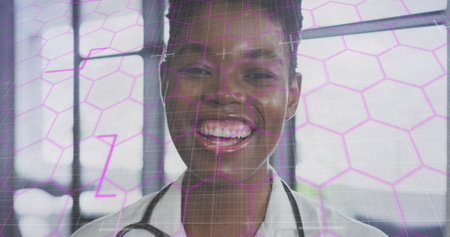 Image of shapes over african american female doctor. senior home hangout and digital interface concept digitally generated image.