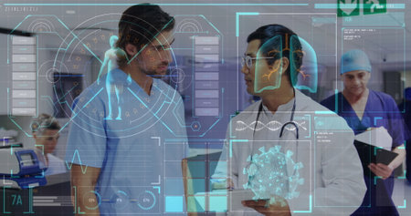 Image of floating Covid-19 cell and schemes of human over Caucasian male nurse talking with biracial doctor at hospital. Medical staff during Covid-19 coronavirus pandemic concept.