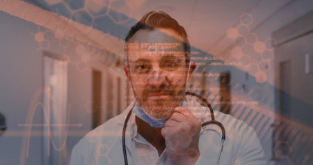 Image of chemical structures and data processing over caucasian male doctor. Global medicine, data processing and science concept digitally generated image.