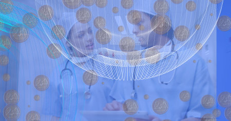 Image of falling coins over two caucasian doctors. Global business, finances, data processing and digital interface concept digitally generated image.