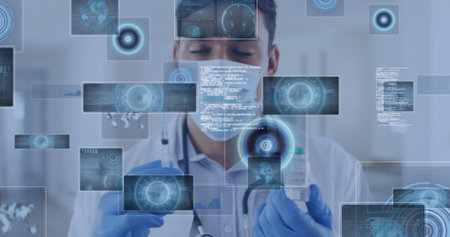 Clinician wearing mask and gloves preparing injection in lab, with syringe vaccine vial data panels. Medical, healthcare, futuristic, digital, technology, laboratory, precision