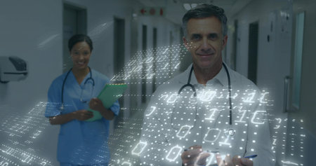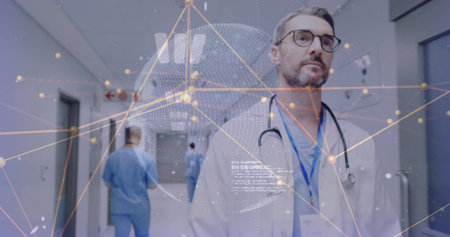 Walking mature male physician progressing down hospital corridor, lab coat and digital overlay. Doctor, stethoscope, hallway, staff, clinical, medical, holographic