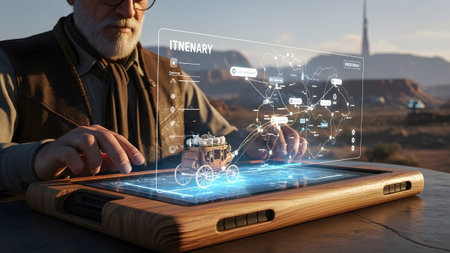 Elderly man with beard uses holographic itinerary map with a horse-drawn carriage.