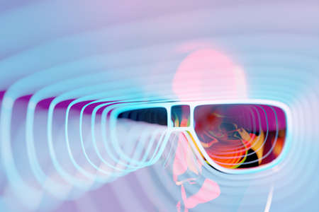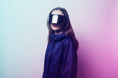 Beautiful young woman adjusting futuristic glasses against colorful background