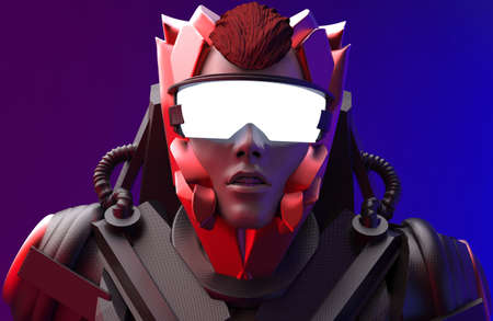 3d render lowpoly illustration of sci-fi warrior woman in futuristic robot armored suit and glasses on red background.