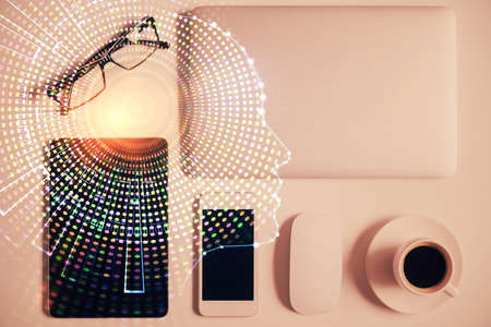 Double exposure of drawing man in AR glasses over table with phone. Top view. VR concept.