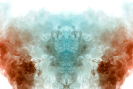 Mystical pattern of orange and blue colored smoke in the shape of a ghost's face with big eyes and an open mouth creating a feeling of fear on a white isolated background from a horror movie.