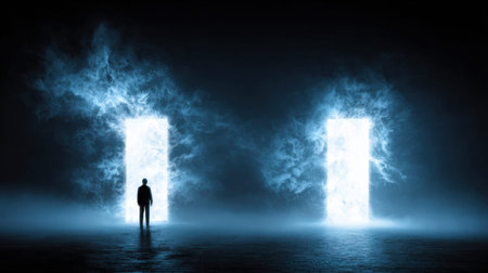 A human figure is surrounded by fog while two glowing exits are seen ahead. The setting is dark and adds a sense of curiosity about the exits.