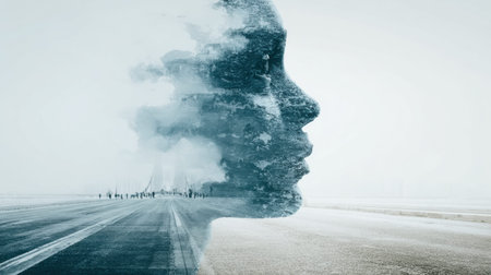 A road leads into the distance while a human profile merges with the scene, capturing the essence of a journey and introspection in winter.
