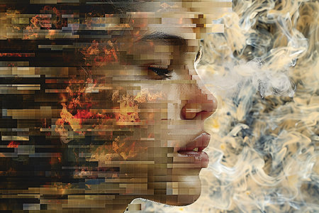 Profile view of a woman with a digital art effect, blending smoke and vibrant colors.
