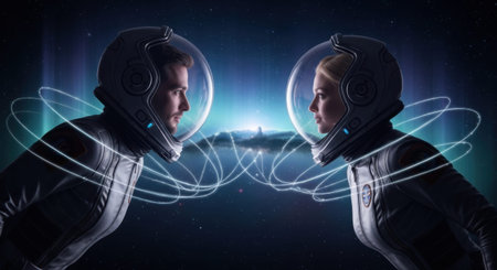 Dynamic double exposure portrait of a young man and woman, her profile merging with abstract swirls of blue and green