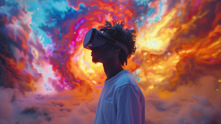 A person stands surrounded by colorful swirling lines and abstract shapes, engaged in a mesmerizing exploration of perception and creativity.
