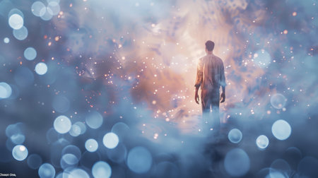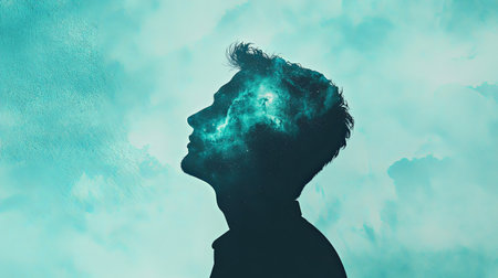 A captivating silhouette of a man merges with a cosmic display, creating an inspiring visual representation of imagination and inner thoughts amid a dreamy sky.