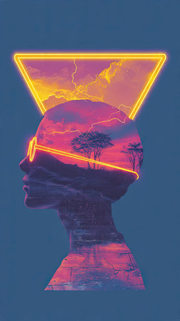 A man's profile is artistically filled with vivid colors and digital patterns, creating a mystical ambiance. The background shimmers with ethereal lights, enhancing the surreal effect.